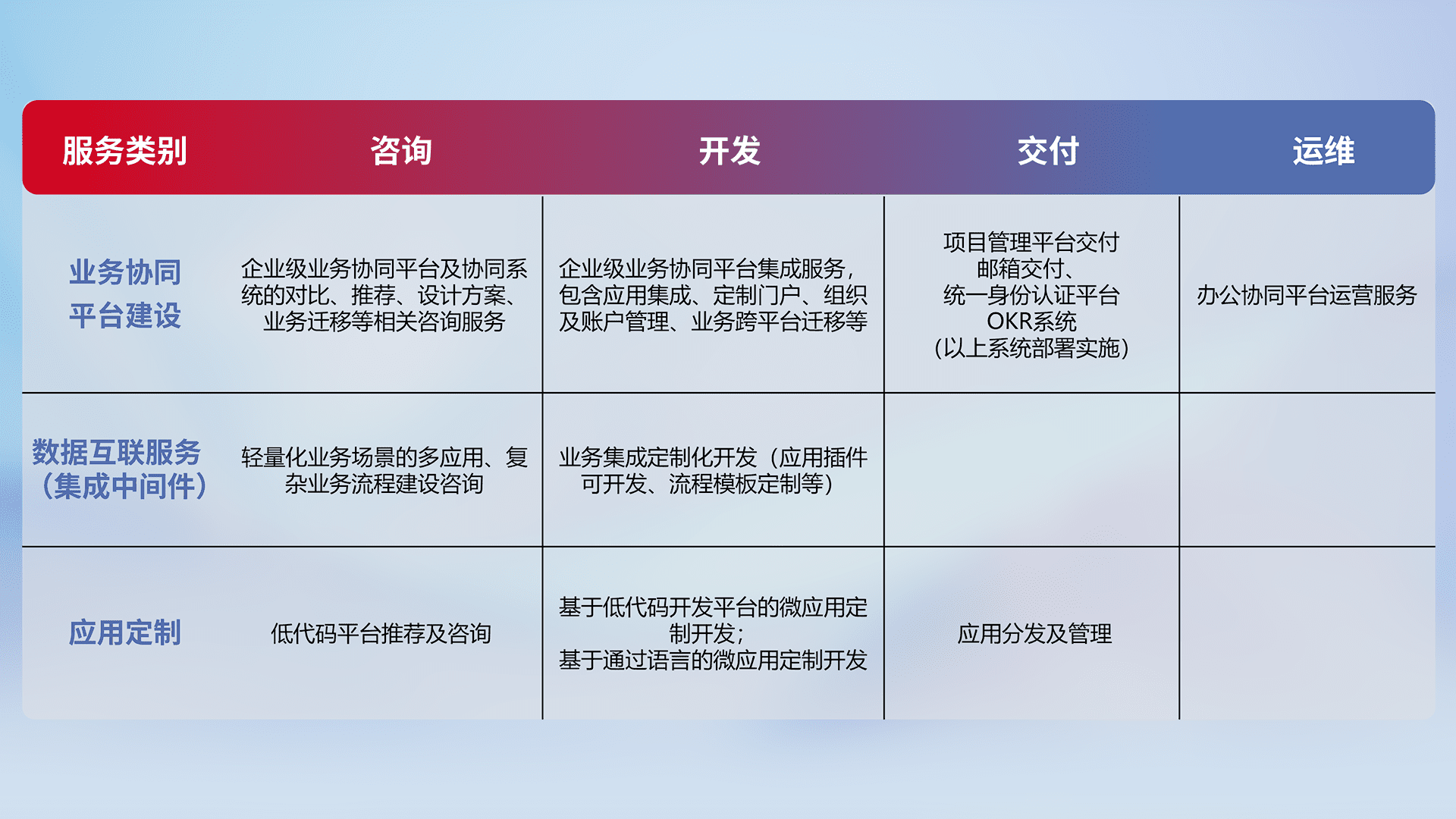 针对钉钉、、、、企微、、、IDaas等平台级产品提供产品的规划、、、方案、、、交付、、、、定制化开发等服务,,实现如统一协同办公、、、、智能客户服务、、、、混合会议管理、、智能数据查询、、、、等业务场景,,实现数字化转型。。